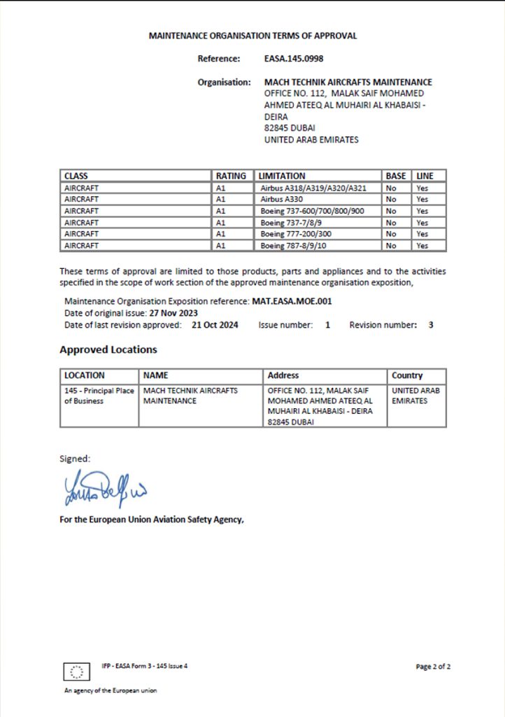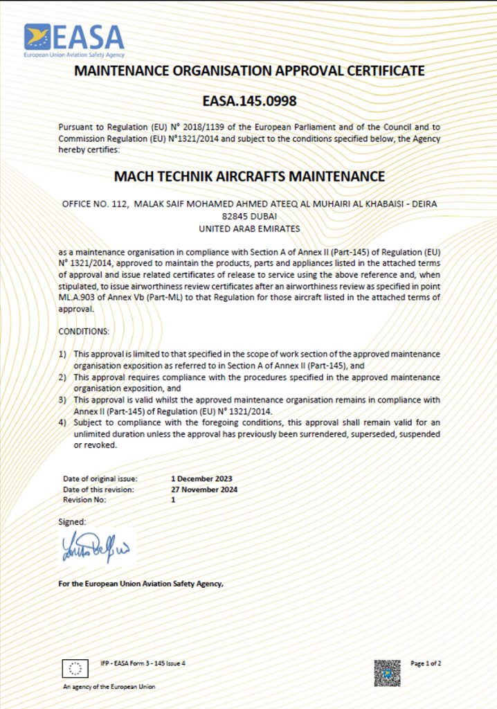 MACH TECHNIK Aircraft maintenance is currently holding EASA Part 145 approval.